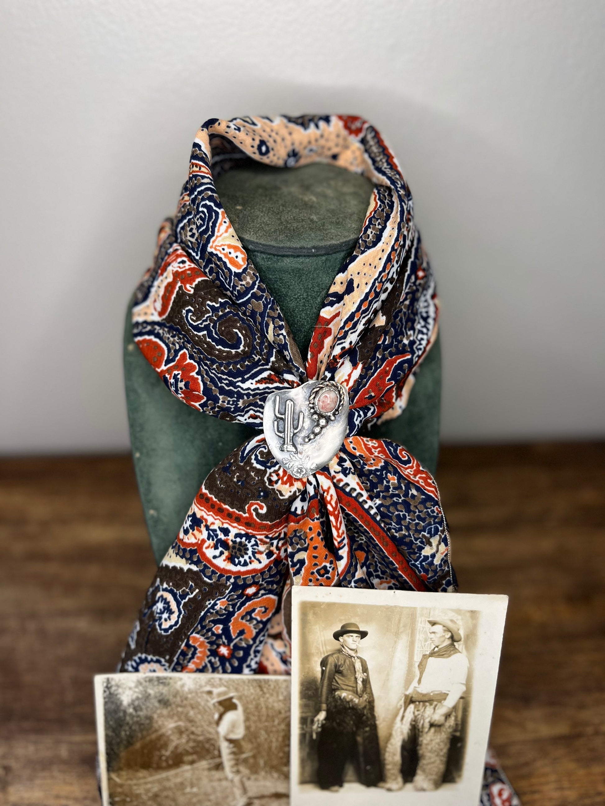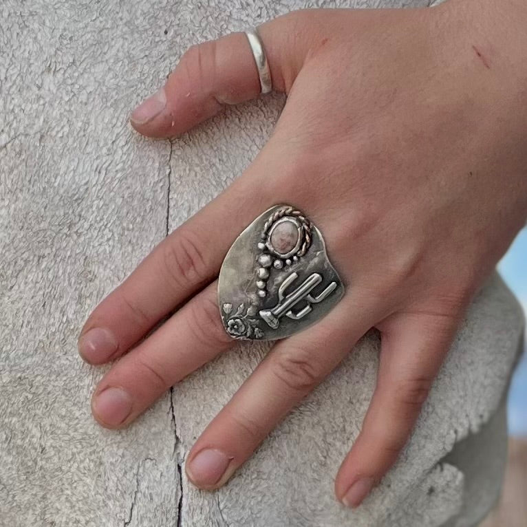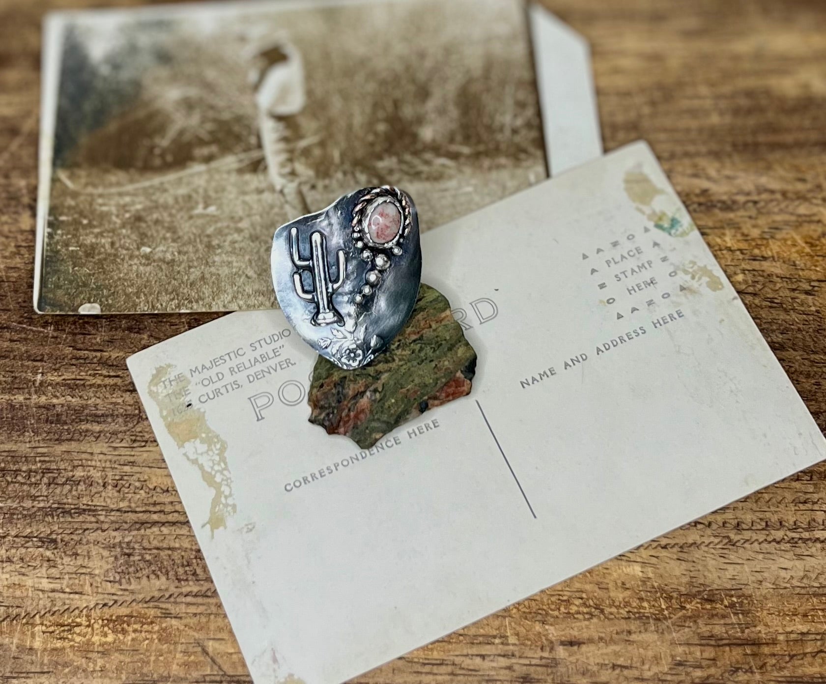 This beauty is crafted using a vintage sterling souvenir spoon from Mexico. It features a sterling saguaro cactus, a sweet little sunstone, and a twisted copper wire detail.