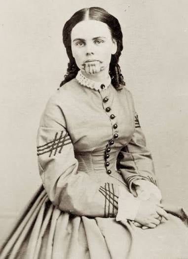 Named after Olive Oatman, the woman with the facial tattoos. She was on her way out west to a new life when her family was massacred in 1851 in what we now call Arizona. Her brother, one of her sisters, and her survived. Her brother was left for dead and her sister and her were taken, her sister Mary Ann eventually passed while in captivity, and eventually Olive was traded to the Mojave people, while she was enslaved she was tattooed, left with a permanent mark upon her face. Her older brother never stopped looking for her and 5 years later she was found. She went on the lecture about her experiences sharing her story with the masses. She was known to be the first white woman photographed on record with a tribal tattoo.